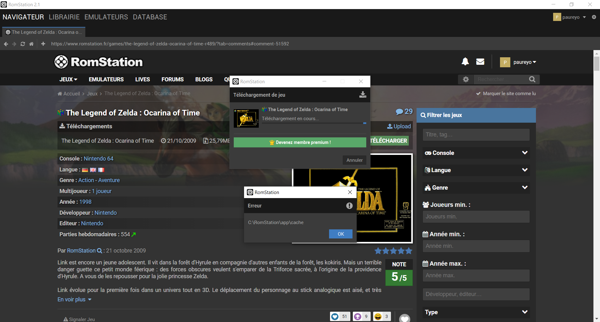 Le problème principal pour lequel je vous écris, c'est que lorsque je clique sur le bouton "Télécharger" afin de télécharger un jeu (au hasard : The Legend of Zelda : Ocarina of Time), une fenêtre apparaît avec le message suivant : "Erreur C/Romstation/app/cache" (cf. image ci-jointe).