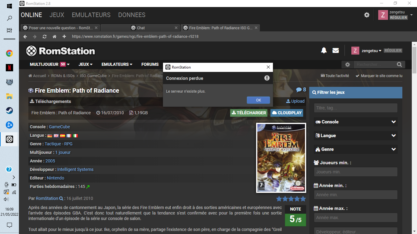 zengetsu Posted May 21, 2022 Share Posted May 21, 2022 bonjour je jouais à fire emlem path of radiance sur le cloudplay rom station depuis qlq jour et depuis 2 jours je lance le jeu et le serveur se coupe au bout de qlq seconde avec le message ci dessous ... j ai essayer de reprendre une sauvegarde précédente le problème apparait aussi . je n ai pas de soucis au niveau de l internet étant en fibre le débit est largement suffisant pour faire tourné le flux video j ai fait des test sur d autre jeux/émulateurs il n'y as pas de soucis que ce soit sur ps2 ou gamecube par exemple les jeux tournes sans problème pdt plusieurs heure non stop sans bug j ai essayer par exemple a plusieurs reprise de joue sur FE le bug survient je lance un autre jeu sur game cube aussi pas de soucis je joue plusieurs heure sans problème je relance une partie sur FE => bug je refait test sur FE => rebug je lance un autre jeux/ émulateur pas de soucis et j'ai fait ca plusieurs fois avec tjs le même résultat … si qlq un a une info sur le pourquoi je suis preneur merci d'avance Link to comment Share on other sites More sharing options...