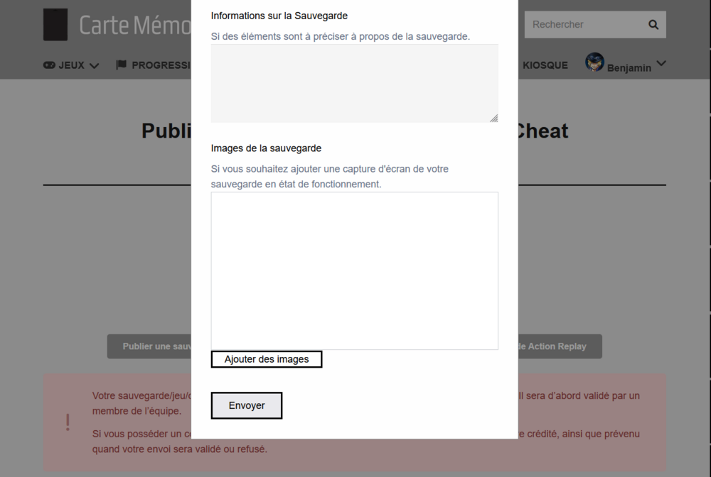 MajinSimon Posted March 20, 2023 Share Posted March 20, 2023 Le 04/11/2022 à 10:48, Tanuki78 a dit : Salut, Ca va faire un petit temps que je suis sur un projet de site pour partager ses sauvegardes et savestates de ses jeux favoris pour que d'autres puissent les utiliser ! Je vous propose ici un lien pour accéder au site, il y a des choses à améliorer (c'est sur), donc n'hésitez pas à me remonter les remarques que vous avez à faire. https://cartememoire.org Vous pouvez télécharger les sauvegardes sans compte sur le site. Si vous voulez proposer une sauvegarde, vous pouvez utiliser le formulaire présent dans la barre de menu pour partager tout ça (de même si vous voulez proposer un jeu), il vous faudra un compte pour pouvoir partager une sauvegarde par contre. Vous trouverez aussi plus tard des tutoriels vous expliquant comment importer ces sauvegardes. Si vous avez des questions ou autre, n'hésitez pas à me contacter ! Merci d'avance à tout ceux qui vont s'intéresser au site ! slt on ft comment pour mettre les sauvegarde ? stp ? et si ta un lien ou qlq chose une version moddé de budokai je suis preneur Link to comment Share on other sites More sharing options...