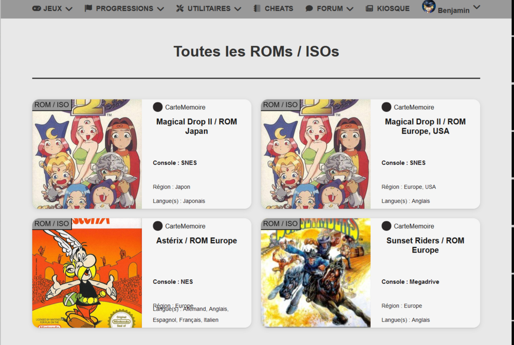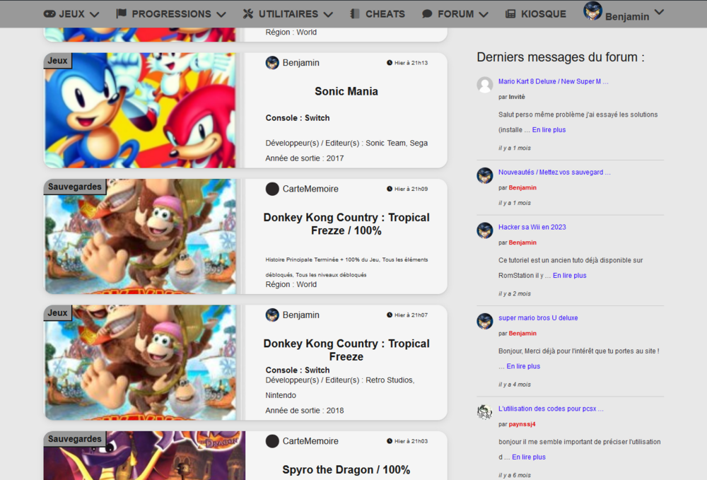 BenjaminCM Posted June 12, 2023 Author Share Posted June 12, 2023 Salut, Ça fait un bon moment que je m'étais pas exprimé ici. J'avais laissé un peu de côté le site dût à certains éléments et une petite baisse de motivation. Mais je me suis remis dessus et on retrouve pas mal de changements et de nouveautés. Tout d'abord, la plus grande nouveauté, les précieux ROMs / ISOs commencent à être hébergé sur le site : ( https://cartememoire.org/game-files-all ) Il n'est pas question de faire de l'ombre à RomStation ou bien d'autres plate-formes d'émulation que je fréquente, mais d'en ajouter une nouvelle pour apporter ma pierre à l'édifice (Une fois de plus) et aider à la préservation du patrimoine Vidéoludique. Donc, si vous souhaitez avoir un jeu en particulier, n'hésitez pas à le demander ci-dessous. (Le partage de ROMs / ISOs n'est pas pour le moment ouvert au public.) Autre ajout, lorsque vous publiez une sauvegarde, vous pouvez ajouter une capture d'écran de votre sauvegarde : Pour aller sur les changements, la page d'accueil a été complétement refaite en ajoutant une bannière d'Annonces et de mise en avant, ainsi qu'un vrai fil d'actualité regroupé (Plutôt que éclaté à l'époque) : Pour terminer, nous allons parler du serveur Discord, qui était inactif. Nous avons décidé de fusionner avec le serveur Discord non officiel de RomStation (Plus d'informations sur ce sujet : https://www.romstation.fr/forums/topic/67933-discord-non-officiel-de-romstation-👾/ ) afin de donner une seconde jeunesse à notre serveur. Des suggestions, des demandes de jeux ? N'hésitez pas à le faire savoir ci-dessous en répondant dans ce sujet ! cliXLittleJo and Bibinou67 2 Link to comment Share on other sites More sharing options...