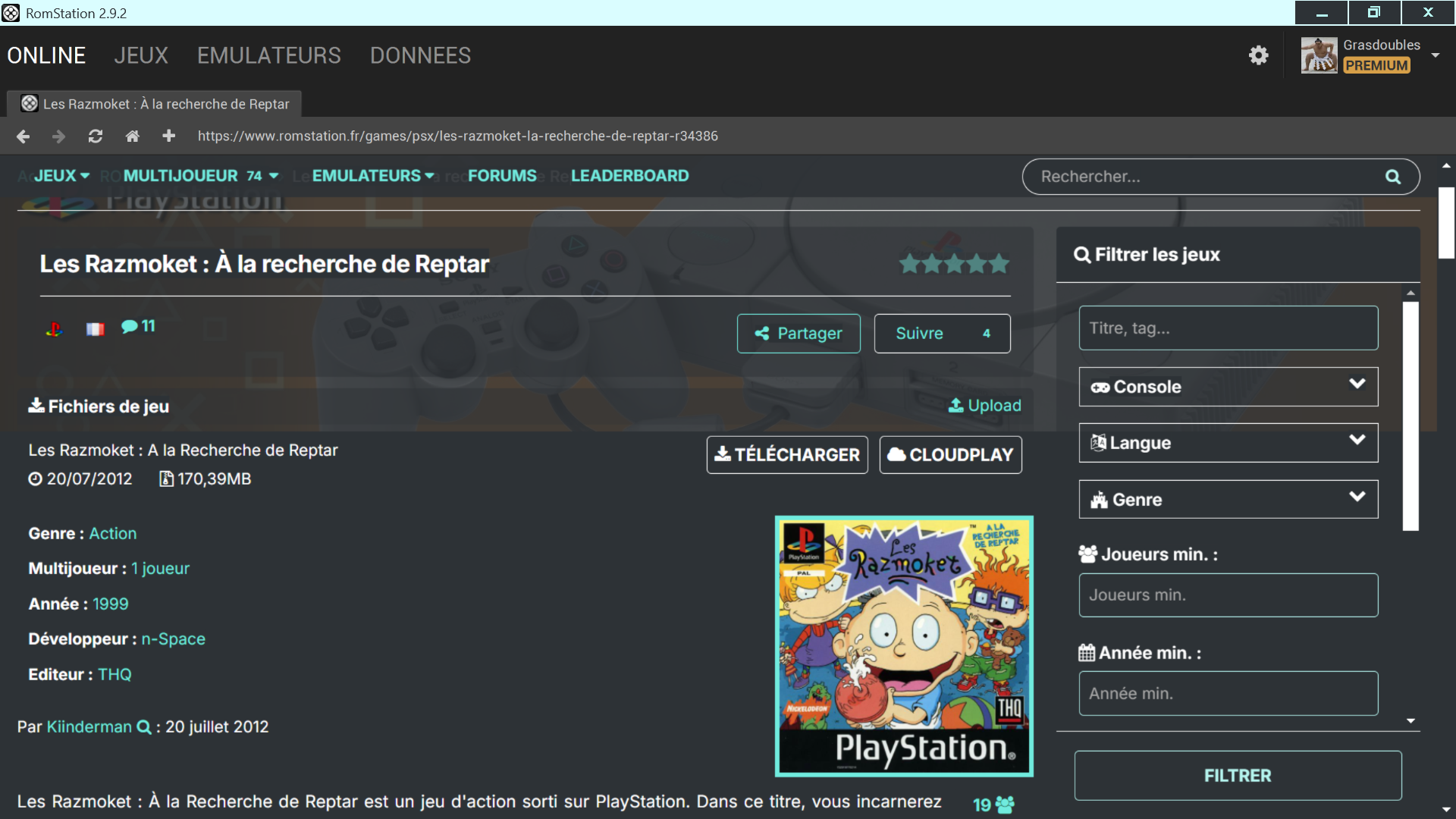 Grasdoubles Posted Friday at 05:09 PM Share Posted Friday at 05:09 PM si c'est celui la il est dispo sur romstation, tu tape razmoket dans la section playstation du site, puis tu va tomber sur la vérsion --anglaise-- les rygrats et en bas dans les vérsions altérnative tu a la vérsion française 😉 Link to comment Share on other sites More sharing options...