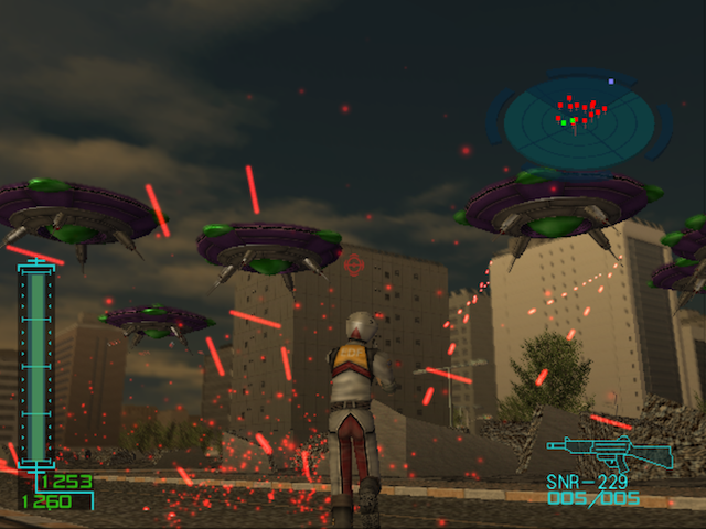 Another swarm enemy is the drone, which resembles a flying saucer. Like the giant insects, the drones' strength comes in numbers. However, as airborne units, the drones are more agile; so destroying the drones requires the right sortie and strategy.