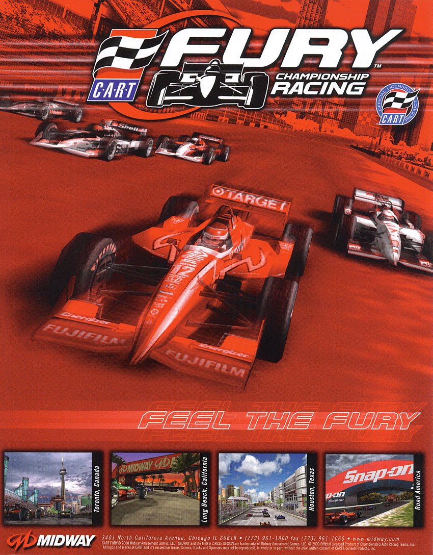 CART Fury is one of Midway's more realistic arcade racing titles. It features the Championship Auto Racing Teams license, championship drivers including Jimmy Vasser and Michael Andretti, and actual CART race courses such as Chicago Motor Speedway and Surfers Paradise, Australia. The game is similar to the Cruis'n and Thunder series with its checkpoints and fantasy tracks, except that you have a Boost Meter you use to get ahead of the other drivers. The If you complete a lap within a designated time, you get Superboost--a trail of fire to leave the other drivers in the dust!