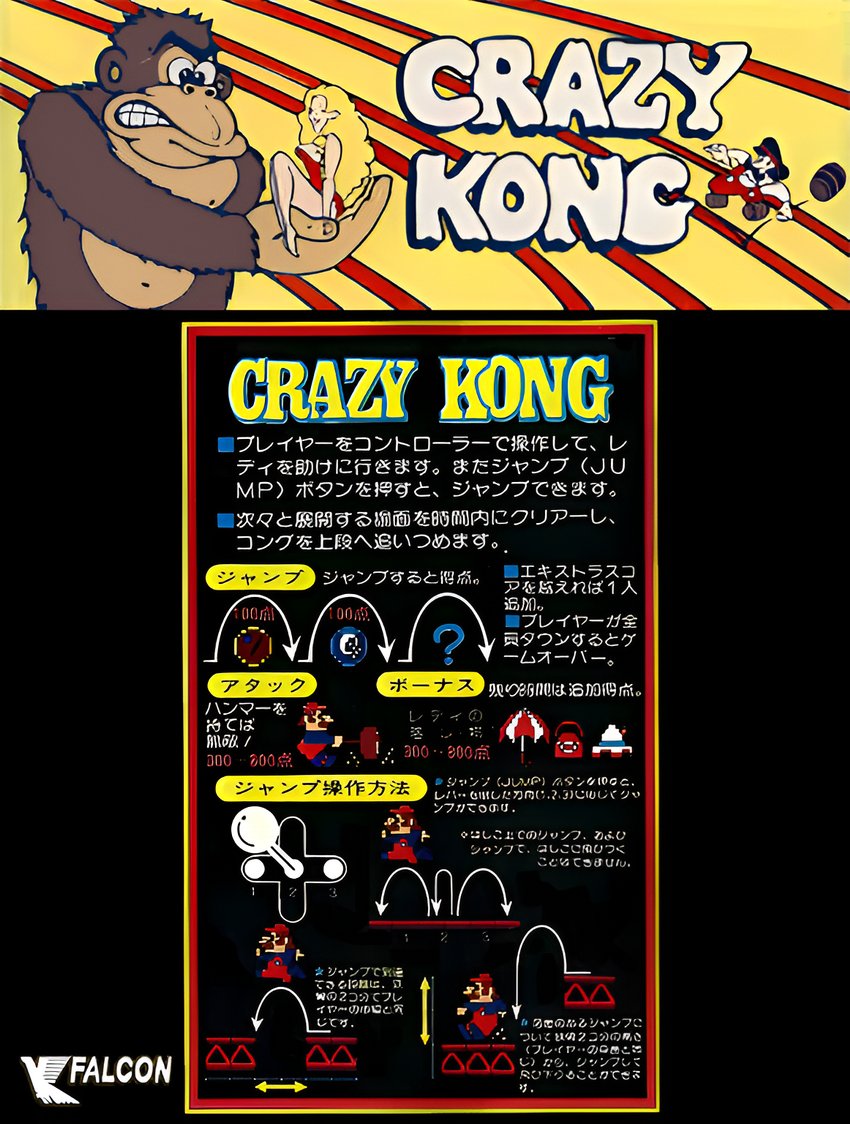 Crazy Kong is an arcade game created by Falcon, released in 1981 and similar to Nintendo's Donkey Kong. Although often confused with a bootleg release, the game is officially licensed for non-US markets and is based on different hardware. The game retains all the gameplay elements of Donkey Kong, but all the graphics are redesigned and recolored. Crazy Kong is also known as Congorilla, Crazy Kong Part II and Monkey Donkey. There are two versions of the original Crazy Kong and Crazy Kong Part II; whose differences lie in minor cinematic artifacts and bugs, color palette choices, and minor gameplay differences. Crazy Kong Part I does not display any copyright or company names on the title screen. Crazy Kong (parts I and II) runs on modified Crazy Climber hardware. Additionally, there are other versions of the game that run on Scramble, Jeutel, Orca and Alca hardware. Official versions of the game were available in two different standing cabinets that featured an angry, rather than comical, great ape integrated into the artwork. The cabinets were created by Zaccaria.
