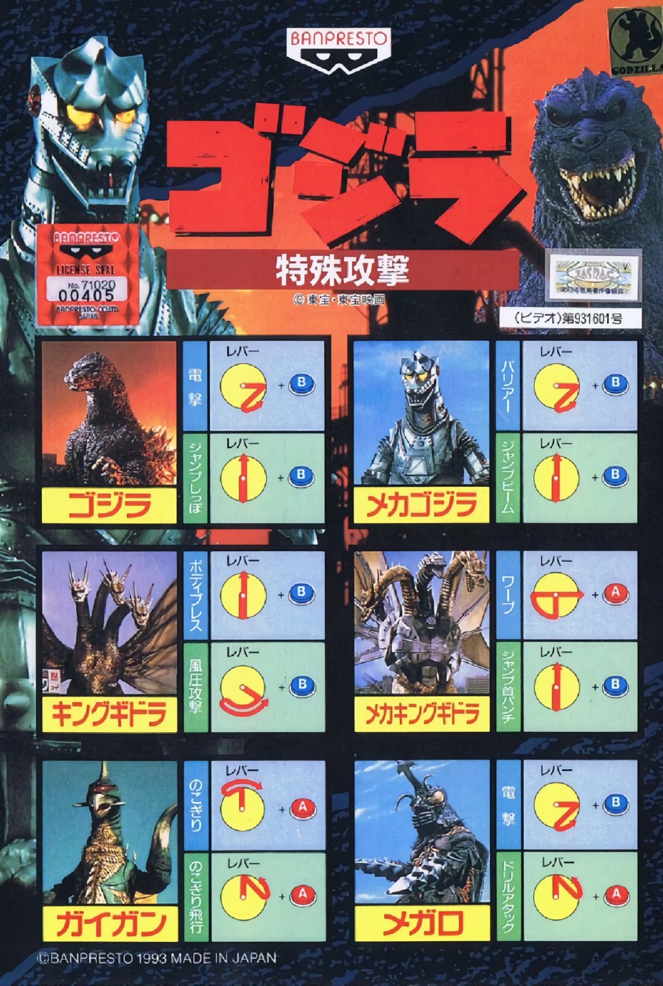 This arcade game has a few monsters that are playable, a few that can't be played as and a few that make cameos. All playable monsters in the 1 Player game (except for the one you play as) have many more abilities than what can be accessed in Battle Mode. All monsters can jump, jump and kick/punch, do a tail swipe, grab and throw, punch and kick, and block. Most have a beam weapon, though some don't. All playable monsters have alternate colors to distinguish between the same monster in muliplayer mode.