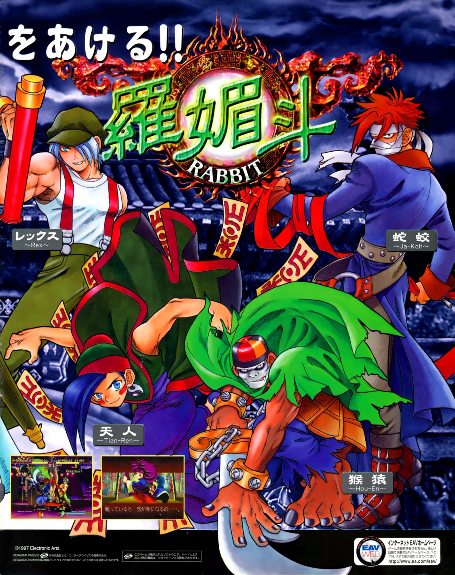 An obscure Japan-only game from EA?s Japanese branch, Rabbit features a four-button combat system, and pressing certain buttons together can summon your animal spirit(which was mapped to a fifth button for the home release). While the game features dodges, recovery rolls, ground hits, deflections, dashes, and hops, the animal spirit is the real focus here. By dealing and receiving damage, the player?s power bar builds up at the bottom. Once filled, the player can summon their animal spirit and use it to execute special or super moves. Defeat a character in arcade, and you?ll take their animal spirit, allowing you to summon and use them. So if the player started with the rabbit and gained the snake in the first match, he could use both?s moves in the second match. This encourages players to learn all of the animal spirits, and gives them options. In Versus mode, both players have access to all of these animal spirits. It?s an interesting concept, despite the game being a bit cutesy.