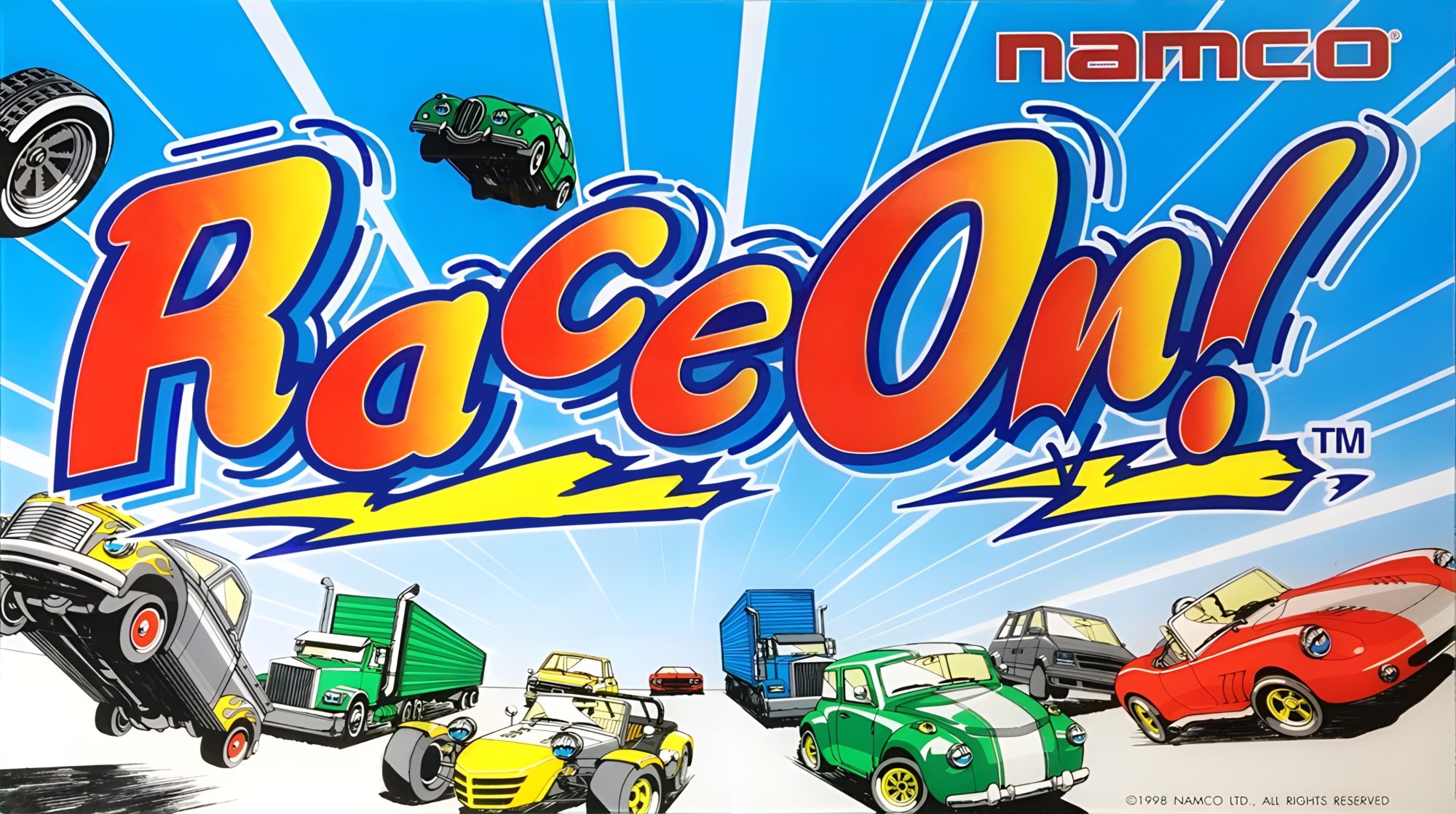 Race On! is a Namco driving arcade game released in September 1998 on the Super System 23 hardware. It features 3D graphics, various tracks (off-road, suburban, underground), and a unique camera feature that takes a photo of the player to superimpose onto their car. It is known for being a fast-paced, multi-screen capable arcade cabinet.