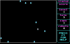 The manipulating of your player include moving your player by turns with cursor keys, teleporting your player randomly on the screen for limited number of times (you will always be teleported to a safe area where no robots can smash into you before giving you a chance to move), killing all robots in squares contiguous to your player for limited number of times, allowing you to make the robots move one turn while keeping your player in the same square, and zipping to the next level.