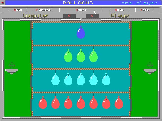 The game shows a number of balloons hung on a series of shelf like levels. Player's take turns to burst the balloons, one or all balloons in a row but only one row can be changed per turn, with the person bursting the last balloon being the loser. The game can be played "player vs player" or "player vs game".