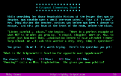 Slay monsters, challenge other characters to single combat, and upgrade your zany equipment (from Toothpick and Ball Cap to Elephant Tusk and Bulletproof Parka) ... and explore an overland map in a fashion unknown in LORD, building forts and encampments across the landscape. Some of the jargon has been changed -- HitPoints become "owies", Gold becomes Pebbles... but the silly pseudo-medieval fun remains much the same.