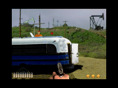A bunch of prisoners have escaped from a prison bus and you, as the Sheriff's deputy, must take them out. Unfortunately, they have had help in escaping, and have been supplied with guns. Blood Bath at Red Falls is a shooting gallery game where the enemies are digitized actors who pop up from behind cover on the different screens. You can shoot for other items including ammo, a better gun, extra hits and lives. Be careful not to shoot innocent hostages who might get in the way. There are three difficulty levels: Easy, Bring it on, and Bad Ass.