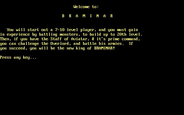 The Overlord has enforced unjust laws throughout the kingdom of Braminar -- raising taxes, enslaving villages, and, worst of all, outlawing hamburgers. You are the stalwart adventurer bold enough to emerge from the ranks, accumulating through exploration the skills, experience, artifacts and followers necessary to undo his burger-hating rule and usher the realm of Braminar into a new golden age.