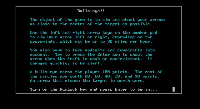 Bulls-eye!! is a shareware archery game for one or two players. The left and right arrows are used to aim an arrow at the target and then the Enter key needs to be pressed to fire the arrow. Aiming is complicated by the wind which blows from left or right with varying intensity, and by draft which deflects the arrows up or down. After compensating for the wind the best time to fire is when there is little or no draft but in this game the this changes rapidly so timing of the shot is essential. There is no end to the game, it continues until the player(s) select either a new game of choose to exit.