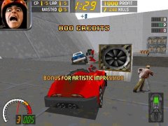 At the beginning of the game the player only has one car and is ranked at #99. The overall objective is to race all the way to the top, collecting the opponents' cars on the way as trophies (and possibly replacements to his vehicle). In the race itself the player tries to damage opponents by driving into them, and can also kill pedestrians. Damage, kills and spectacular moves earn credits for the player which can be used for upgrades and even making repairs to the car at anytime during the race. If you wreck a certain car in 4 races or so, you get to drive it. There are many power-ups strewn around the courses which range from useful to fun to downright absurd. Though the player can win by racing fairly and normally, most players found it much more fun to wreck everything in sight.