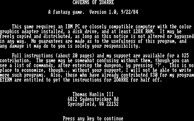 Caverns of Zoarre is a dungeon crawl role playing game similar to Telengard. You may choose to be either a fighter or a sorcerer as you explore the multi-leveled caverns for gold and treasures. Your view of the maze like caverns is top down, and only the area near you is visible. Throughout the caverns are many different types of enemies you'll encounter; you can try to bargain or run to get out of trouble, or fight and use spells to defeat enemies. You can also optionally enable real time fighting instead of turn based. As you explore and (hopefully) win battles, you'll earn experience points and increase your skills. Good luck on your quest!