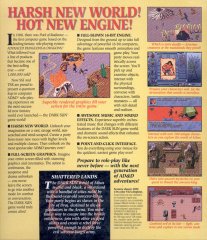 Dark Sun: Shattered Lands is an AD&D game based off of the Dark Sun campaign pack from TSR. In the beginning of the game, the player controls a party of gladiators. It opens up with a fight with a multitude of monsters in an arena. After the battle the party are sent back to the slave pens to wait for their next match. They talk to some of the other gladiators in the slave pens and escape (if they can) to help the free villages established by other escaped slaves. Eventually they must fight back against the totalitarian city-state of Draj and the large army they will soon send to wipe out all of the slave villages.