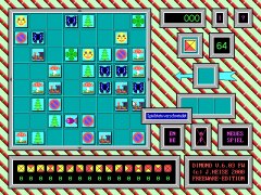 Dimono is a puzzle game where the main objective is to fill all squares of a 8x8 board with game pieces ("stones") while scoring the maximum amount of points possible. Each piece is a rectangular shape with coloured sides that can be either yellow or red. While the player is free to choose the square where to place the first piece, all subsequent pieces must be placed next to each other, and only if their adjacent sides match in colour. This means that each piece placed on the board limits the possibilities for further placement. Points are awarded for each piece placed, with higher score for more difficult moves: difficulty is measured by the number of adjacent stones that need to be matched in colour.