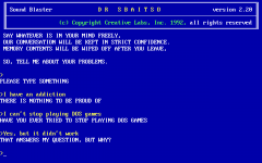Dr. Sbaitso was an artificial intelligence program for MS DOS-based personal computers distributed with various sound cards published by Creative Labs (the name was an acronym for Sound Blaster Acting Intelligent Text to Speech Operator) in the early 1990s. The program would "converse" with the user as if it was a psychologist, though most of its responses were along the lines of "WHY DO YOU FEEL THAT WAY?" rather than any sort of complicated interaction (when confronted with a phrase it could not understand, it would often reply with something such as "THAT'S NOT MY PROBLEM"). Dr. Sbaitso would repeat text out loud that was typed after the word "SAY". Repeated swearing or abusive behavior on the part of the user would cause Dr. Sbaitso to "break down" in a "PARITY ERR" before resetting himself.
