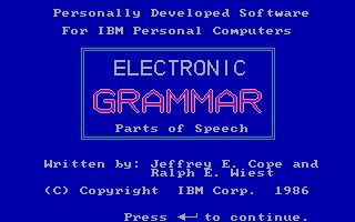 Cutesy critters EG (pronounced Eegee) and his friends Blip and the Its are your hosts in this game which, true to its title, imparts knowledge of the English grammar, with chapters covering the different parts of speech - from nouns and pronouns to conjunctions and interjections, and everything in between. Short summaries of the subject matter are presented, followed by free-response or multiple choice questions: correct answers are rewarded with EG's excited hopping, whereas mistakes will just have him slowly shaking his head (and explaining your error).