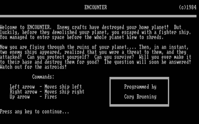 Somewhat similar to Space Invaders, you pilot a craft that is flying through space while avoiding pieces of your destroyed planet and being shot by the alien space craft who destroyed your planet. You must destroy those craft before running out of fuel. Rather than a full screen of enemies to destroy, you start out the game only needing to fight two spaceships... but that is just the beginning.