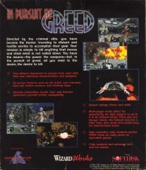 It is the year 15432, and criminal organizations are flourishing. Scavenging has become increasing profitable, since the criminal elite is willing to pay big money for their shady undertakings. A mysterious group known as A.V.C. contacts the acquisition squad Red Hunter to perform missions for them in particularly dangerous environments. The team departs on its needling ship, hoping to gain fame and riches in this perilous endeavor.In Pursuit of Greed is a shareware raycasting 3D (2.5D) first-person shooter. Over the course of the game, the player gains access to five different playable characters, though the differences between them are mostly cosmetic. The protagonists can use melee weapons (such as daggers), but mostly rely on firearms. It is also possible to pick up and throw grenades. Ammunition and power-ups are randomly generated.