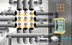Spanish puzzle game, divided into several levels. In the central part of the screen there are 9 or 16 creatures or objects (angry workers, helmets with eyes, blue gears, anthropomorphic hammers and wrenches), put in the form of a 3x3 or 4x4 square; on either of the four sides of this grid there are three or four pipes, that is, one for each row and column. The control is carried out by the mouse cursor, which by default has the shape of a "vertical" screwdriver with a pink handle. When you put it up to the pipe, the color of the latter changes to green (and if the structure is horizontal, the tool assumes a "lying" position). At the top right is the image of the latter, in which all the figures are arranged in a certain way, and the task at each level is to repeat this alignment on the playing field. This is achieved by clicking on the pipe ends, as a result of which the figures in a row or column are shifted by one position in the corresponding direction.