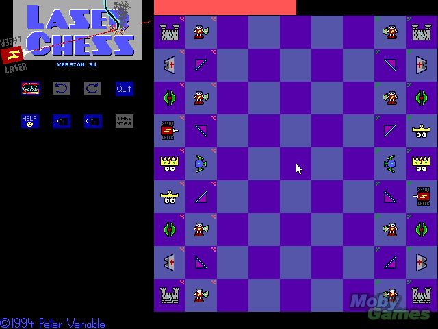 Chess and destructive laser beams together at last! Laser Chess, which is a DOS version of the award winning original, for the most part plays like a regular chess game except that some pieces have been replaced by deflectors and a laser cannon. You move your pieces on the board as usual but have to place your deflectors in strategic positions all the while keeping an eye on your opponent doing the same thing during their turn. Turns are used up when you move a piece, rotate a piece or fire the laser. Once you feel a deflector is in the right place, unleash your laser and shoot the opposing players. Be careful though, because some pieces if rotated in the wrong direction will bounce the beam or split it in wrong directions and even worse can even bounce back at your laser cannon destroying it. Check mate means the game is done.