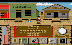 One of the most exhaustedly researched games I've ever played; you're an old timer looking for the "Lost Dutchman Mine". The game begins you with a scarce amount of gold to buy the items you'll need to not only survive in the desert, but for gold panning and you'll need that pick axe! Along the way, you'll encounter those other folks that'll run you out of the area with shotguns and pistols! Watch out! A poisonous snake can end it all or if you're lucky you can make it back into town to the doc for a cure. Good luck old timer - if you're ever gonna search the Superstition Mountains with luck - well, you get my drift.