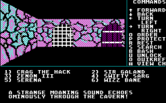 This is the first game in the Might and Magic series, and one of the prototypes of role-playing games in general. The entire game is viewed from first-person perspective. The player creates a party of six adventurers, with traditional classes to choose from (fighter, cleric, etc.). The player also specifies the gender and the age of the characters - they grow old and will eventually die of natural causes. As in most RPGs, the gameplay revolves around exploring the game world, performing quests, and leveling up to be able to proceed to the story-advancing challenges. The turn-based battles typically take place against six monsters, but enemy reinforcements can appear once their comrades have been slain.