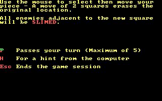 Slime is an adaptation of Ataxx. This board game takes place on a 7x7 square board, with both players starting with two pawns in the opposite corners. Each turn, a player can move one of his pawn two spaces away, or clone a pawn onto an adjacent square. Putting a pawn next to an opponent's pawns converts them to the player's pawns. The game is finished when one of the players has no more pawns, or when the board is filled completely, at which point the player with more pawns wins. Some squares on the board are blocked and inaccessible to either player; their layout in each game is chosen randomly. There is a 20 second limit for the human players to move.