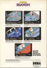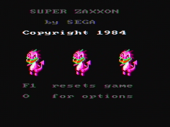 Super Zaxxon is a three-quarter perspective, space shooter style game. You must first go over a base on an asteroid. Things located on this base include gun implacements, fuel tanks, radar stations, missiles, and fighters. After you successfully navigate this base, you will go through a tunnel to tangle with enemy fighters, mine layers, and mines. You then will have to navigate through a series of barriers on another asteroid in order to take on the Super Zaxxon's, the enemy robot dragons.