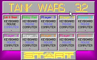 Tank Wars is a shareware game for two to ten players based on the same ideas as Artillery and it's more well known cousin Scorched Earth. Any of the players can be computer controlled and there are seven different styles of computer opponent. The game can be played by keyboard, mouse, and the length of a match can be set between one and ninety-nine games.