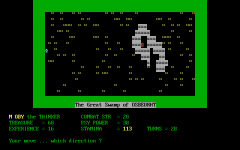 After choosing one of five classes (which only influence strengths and weaknesses), the player starts the journey on the one-screen map of Osbeorth. In each turn, the player moves one field and either encounters nothing, finds treasure or a monster. The latter initiates combat (unless the player surprises the monster and chooses to avoid it) which is basically a sequence of dice rolls. When the player attacks, there is a choice between using the sword (aiming for the head, body or limbs) or a spell. Each monster has two statistics (combat strength and psy power) which should influence the player's choice - a monster without psy power only laughs at spells. Delaying the choice too long results in a missed turn. The player and the monster exchange hits until one of them dies; when the player wins experience points are awarded. More powerful spells are available after earning enough experience.