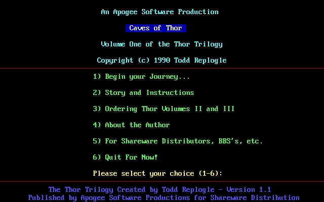 You find yourself trapped deep within Thor's domain. Your mission is to locate three missing items that are scattered throughout the place. The missing items are the Female-item, the Heart-item and the Male-item.The player controls a smiley face through an ASCII-based world. There are many enemies in that world that you have to shoot during your adventure. And you can collect other items like potions, food, coins, shields and keys to sustain your existence .One of the game's features is the freedom of movement: you are allowed to reenter any level. You may find yourself going back up a level from a newly discovered location, and winding up in a completely new area.The trilogy is divided into three episodes, the first of which was originally available as shareware and the subsequent ones upon the payment of a registration fee (all now available as freeware): 1 - Caves of Thor, 2 - Realm of Thor, and 3 - Thor's Revenge.