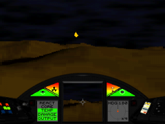 U.S.H.F. -- United States Hover Force is a hovercraft combat training simulator. The flight model utilized in this simulation is unique. Many things have to be considered when piloting your hovercraft. As your hovercraft travels forward and builds momentum, it will continue to travel forward until gravity and wind resistance eventually slow it down. This effect is particularly evident when turning at full throttle. It is possible to be traveling forward with the nose of your craft pointed to the side until the thrust from the engines overpowers the momentum. Driving a wheeled vehicle on ice at high speed would be one example of a hovercrafts flight model. To make sharp turns, use reverse thrust, then turn. You will discover that you can maneuver very effectively using this technique. The turret mounted on top of your ship can rotate 360 degrees as well as up and down. When you have selected a target (by pressing joystick/mouse button 2 or ) the turret will begin tracking the enemy, and will attempt to acquire a clean shot at the target. The center display console displays a view from your turret camera, so that you will always be able to see what you are shooting at. in many cases, you will be firing behind or to the side of yourself. Using the rockets is a bit trickier, since they are launched from a hard-point under your stabilizing wings, you must have your selected target directly in front of you long enough for the rockets seeker heads to lock on.
