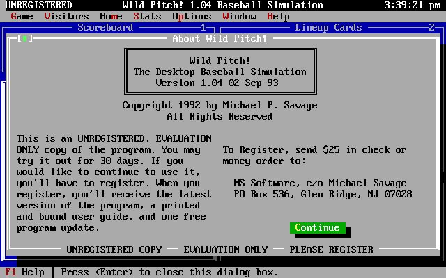 Wild Pitch! is a shareware Baseball simulation.The game places the player in the role of manager, or skipper, of a major league team. In this role the player gets to choose teams, position their defensive players, choose team tactics such as bunt, hit and run, and more. As is usual with team management games many kinds of statistics are available and these can be viewed before, during, or after a match.This is a DOS game but it can be played via the keyboard or via the mouse and it features drop down menu boxes which give it an early windows feel.