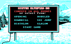 This is a winter sports game that lets you compete in five Olympic events: Downhill skiing, Biathlon, Slalom, Ski Jump and Bob Sled. It is very similar to offerings like Winter Games from Epyx.