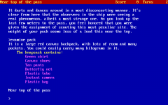 "World" is a game in the tradition of the old mainframe adventures like Colossal Cave and Zork/Dungeon. This means that it's a big game (several hundred locations), with a heavy emphasis on treasure-hunting and exploration. Unlike those games, however, the author has managed to create a much more coherent world - which doesn't stop it from also being a world that is very varied and offers a lot of surprises.