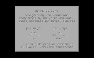 Worms De Luxe is a side product assembled of Digital Warriors components. It's a 'Light Cycle' game for two human players. Each player drives around the board in order to reach the extraction point (blue square). The collision with the opponents trail, the board edge or blocks on the board means a loss of the round.
