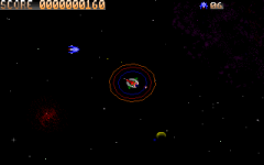 A space shooter with controls similar to Asteroids. The user must shoot towards the center where an enemy craft with several force shields is sitting and firing upon them.