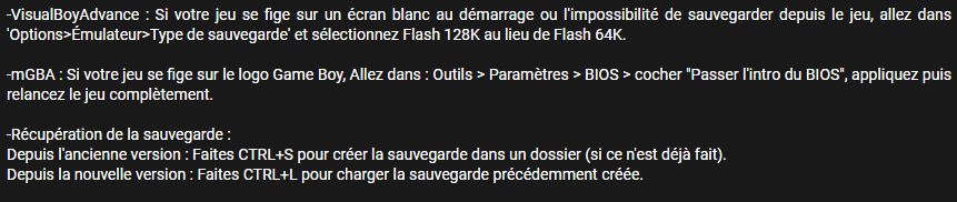 mGBA : Si votre jeu se fige sur le logo Game Boy, Allez dans : Outils > Paramètres > BIOS > cocher "Passer l'intro du BIOS", appliquez puis relancez le jeu complètement.