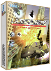L.A. Machineguns is a 3D lightgun shooter played from a first-person perspective. In Los Angeles at 2025, the US President is kidnapped by androids. Two S.I.F.A.T. agents have been dispatched to rescue the president and neutralize the threat at Alcatraz, Las Vegas and then finally Yosemite to eliminate the leader. The requires the player(s) to shoot as many enemy targets in the shortest amount of time and avoid getting hit by enemy opponents and taking care not to hit innocent bystanders. Sometimes critical hits are marked allowing for maximum damage. At the end of each level, the player must destroy a boss vehicle to proceed.