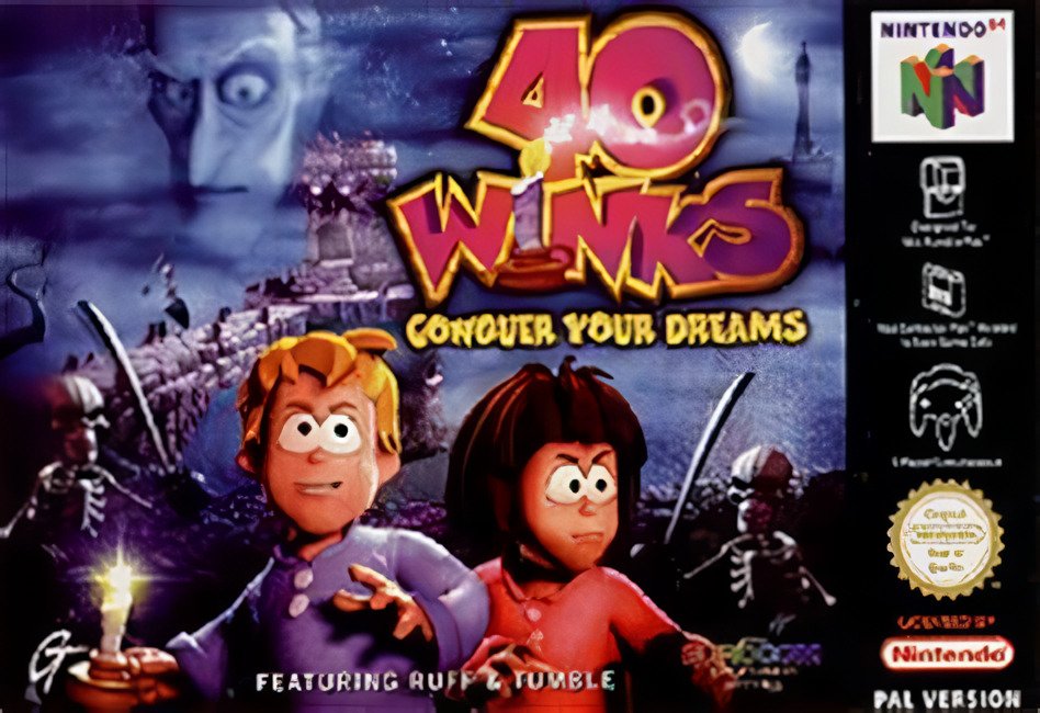 40 Winks is a 3D action-platform game in which you play as Ruff or Tumble, two children who must battle ghosts, goblins and other monsters in their dream-world. They must try to capture 40 winks scattered around the world in order to stop an evil old man named Nitekap. Nitekap wants to turn the winks into hood-winks, the things responsible for nightmares. You also have to find the 12 dream keys to unlock the boss level. A unique aspect of the game allows the players to temporarily morph into different costumes with special abilities. The costumes include a Prehistoric Man, Jester, Super Hero, and Ninja.