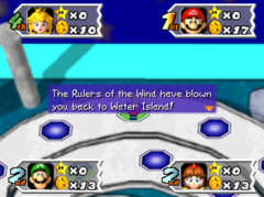 Wind Island: This is where the Rulers of the Wind have settled. In this gusty island, the played will be able to visit the great Boo to steal from other players. The 3 Happening Spaces on this island warp the player to a random island. At the end of the path, a tornado will blow the player back to the START Space! Do you need Boo's shady services to sneak into the lead? Come right in!