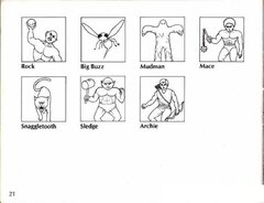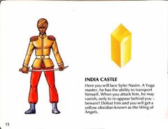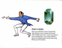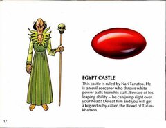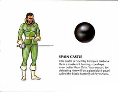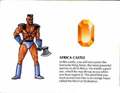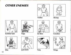 After hundreds of years of chaos, mankind has finally emerged from the ruins of nuclear war. This world of the distant future has once again flourished under the guidance of the Great King, who harnessed the power of the 8 Eyes to rebuild the planet. These strange jewels of power were formed at the eyes, or center, of the eight nuclear explosions which nearly destroyed the Earth. In the wrong hands, the 8 Eyes could cause untold destruction... And now, they have been seized by the Great King's eight Dukes, in a desperate bid to gain control of the world for themselves. They have banished the King to the nuclear wastelands, and already their squabbling threatens to plunge the world into war once again! The task of retrieving the 8 Eyes falls to you, Orin the Falconer, the bravest and mightiest of the King's Guardsmen. With your fighting falcon, Cutrus, you must penetrate each of the 8 Dukes' castles. There you will face the Dukes' soldiers, and battle strange nuclear mutants such as living skeletons, giant wasps, and mud men. You must defeat the monstrous Boss of each castle to retrieve the Jewel of Power he guards. Then, to complete your quest, return the 8 Eyes to the Altar of Peace to await the return of the Great King, so that he may finish the rebuilding of Earth. Your reward will be the eternal gratitude of all mankind!