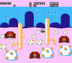 More often than not, some large creatures will reveal a warp gate rather than a dollar bill. You can go through the warp gate to get to another part of the land, and destroy more large creatures. Only one of them will have a warp gate in the form of a 'stop' sign - that is your ticket to the round boss, but you must defeat all large creatures in order to pass through it. Also like in the original can you walk on the ground to avoid approaching enemies, and spend money in the shop to get new weapons (but they only last for a limited time).