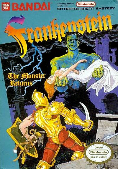 Frankenstein is a side scroller adventure against all sorts of nightmarish creatures. Some might even call it a clone of the more widely known Castlevania games of the NES. You begin the game with nothing but your fists... but may acquire a magical club from enemies. Finding additional powerups with give the club the ability to toss fireballs. There are treasure chests in various rooms as well as characters that can help you in your quest through dialog hints.