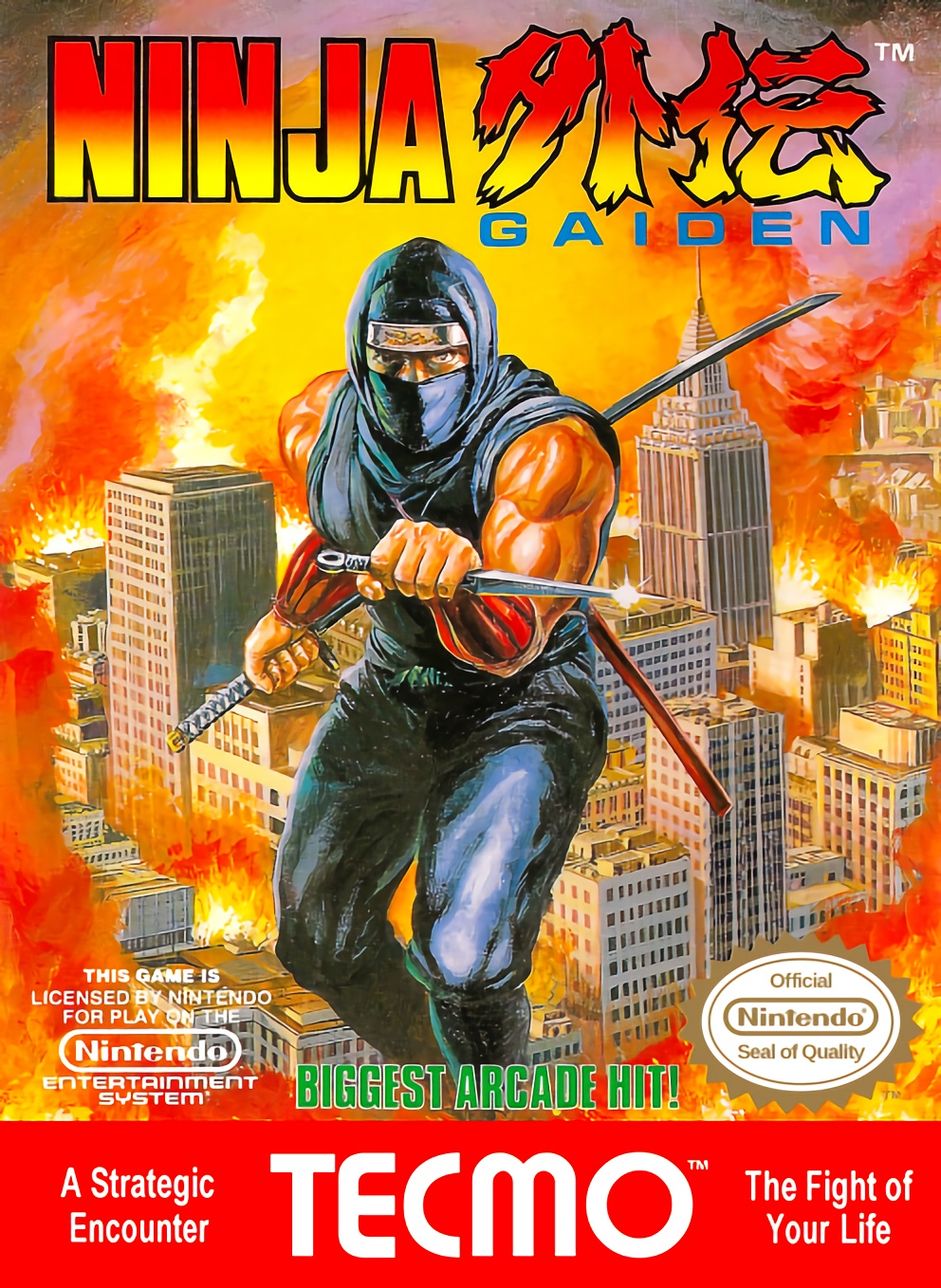 Ninja Gaiden is a side scrolling game where Ryu the ninja can run, jump and slash with his ninja sword. He can also attach to any vertical surface. Power-ups that allow Ryu to toss fireballs and ninja stars as well as perform other feats are scattered throughout the landscape.