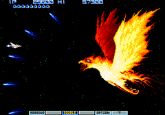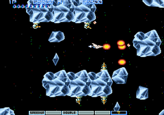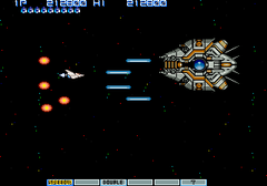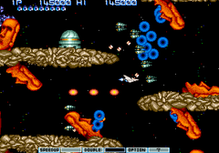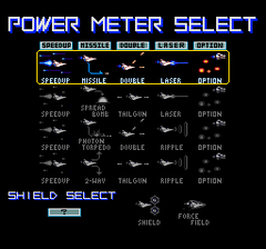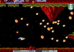 Gradius II is a sequel to Gradius and Life Force, and is a horizontal space shooter composed of seven levels. Like in its predecessor, it is possible to collect power-ups from enemies and choose which type to use and when. This time, this system is enhanced with the option of choosing between four different power-up sequences, allowing the player to use different types of weapons against enemies. There is also the possibility to gain options, which are mysterious balls of fire that follows the player-controlled spaceship closely and mimic all its movements (including shots). While the player only could have two of them in the NES version of Gradius, it is now possible in all versions to have up to four.