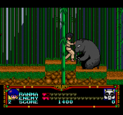 This interpretation of the license follows a part of the initial manga story, starting with the curse and going through Ranma's first conflicts with schoolmates and rival martial artists. The game is mostly structured like a "beat-'em-up" side-scroller, though there are also several boss fights that are more reminiscent of a one-on-one fighting game. The Vs. mode allows the player to recreate these boss fights using different characters.